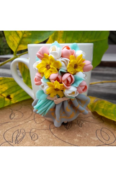 Cana ceramica verde decorata cu figurina realizata manual din pasta polimerica(fimo).