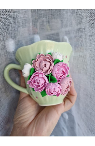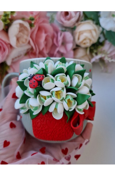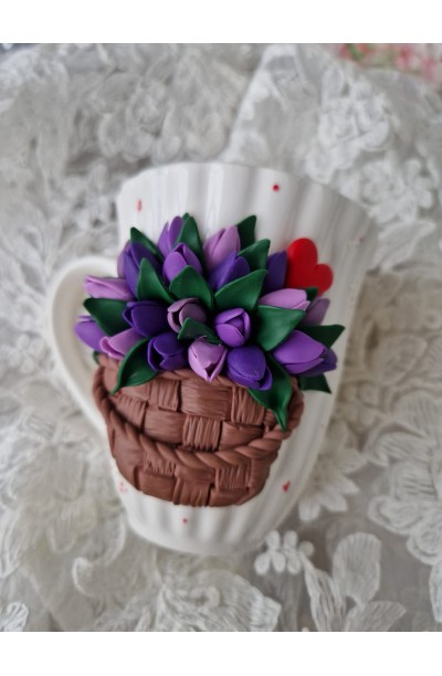 Cana ceramica decorata cu figurina realizata manual din fimo