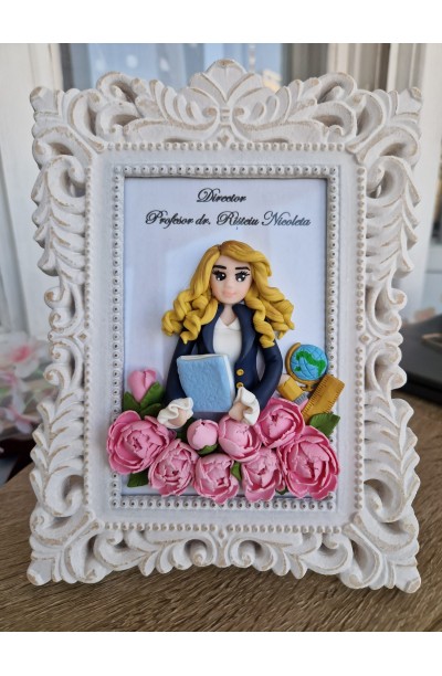 Figurinele sunt lucrate cu lut polimeric, rezistent in timp(funcdalul de asemenea se poate personaliza) si incadrat intr-o rama ce se poate agata pe perete sau aseza pe raft.