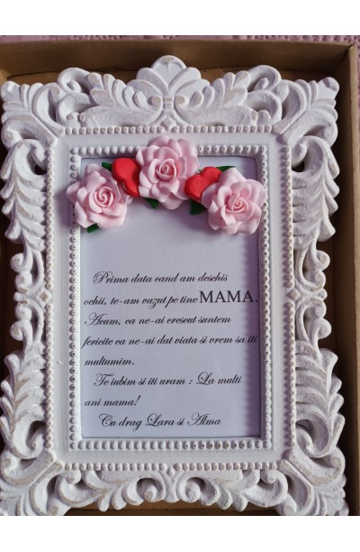 Rama se poate personaliza in functie de preferinte si poate fi un cadou deosebit pentru mama, matusa, nasa sau invatatoare/profesoare.