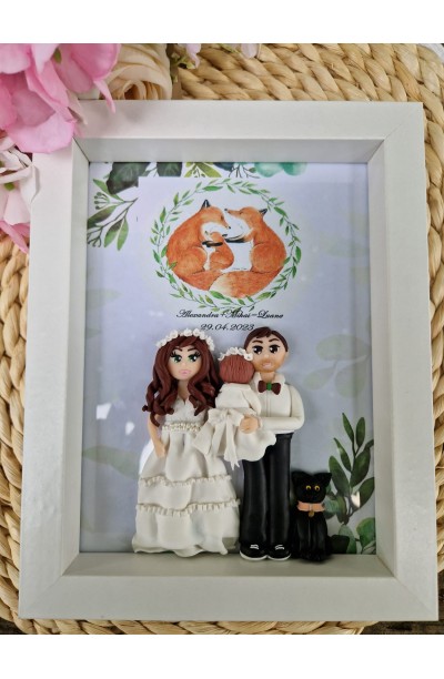 Rama de lemn personalizata cu mesaj si un buchet din fimo lucrat manual.